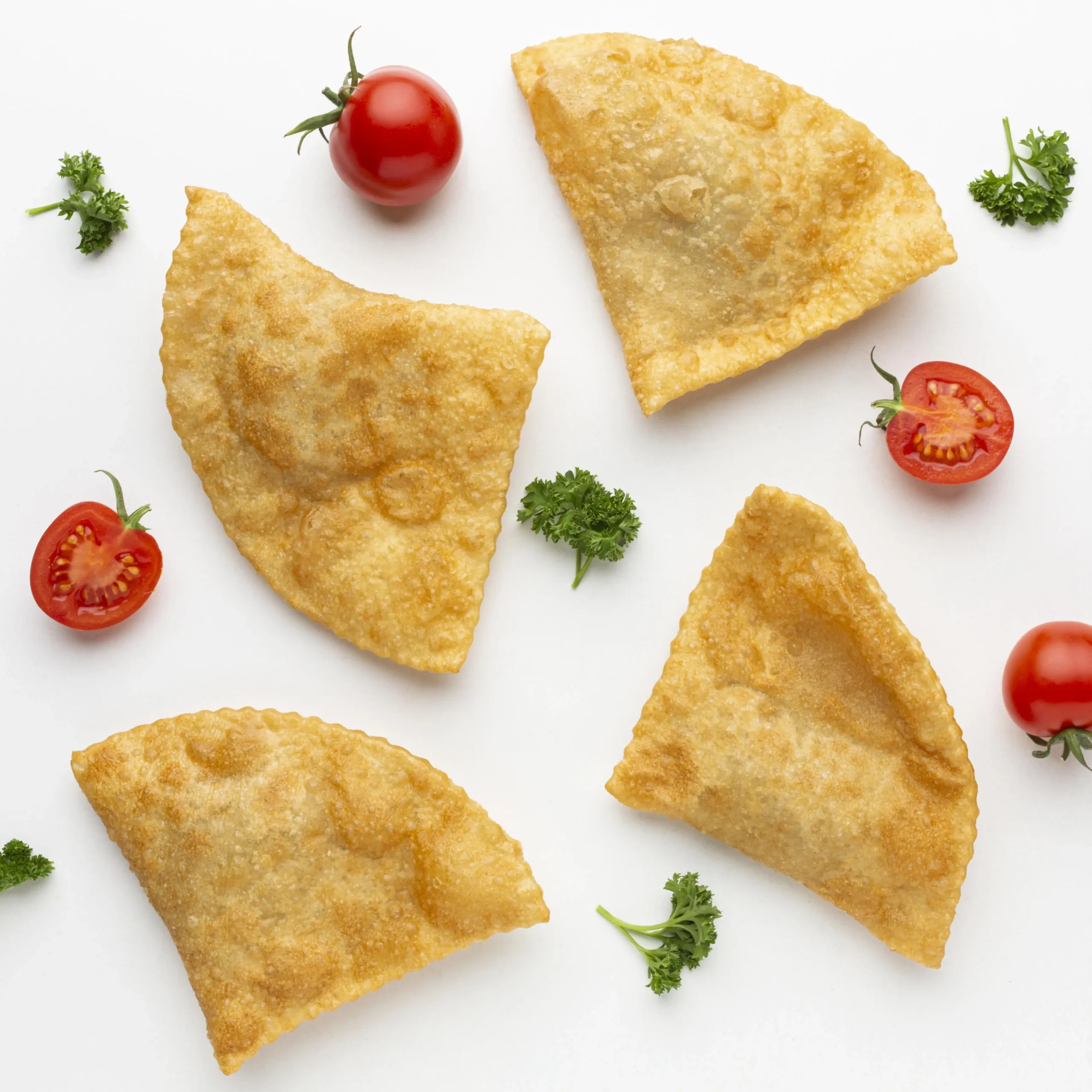 - Coloque uma colher de recheio no centro, dobre em triângulo e passe pela massa de novo se desejar (fechamento duplo)